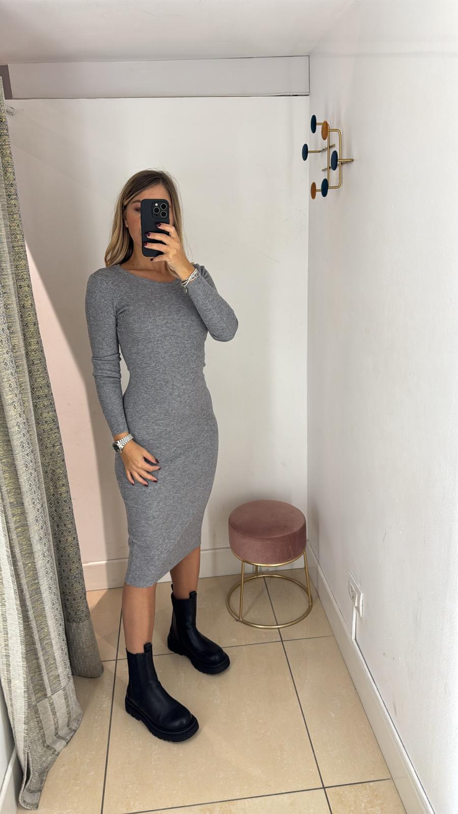 Abito in maglina, manica lunga e girocollo. Vestibilità aderente ma tessuto morbido ed elastico. Da una XS ad una M abbondante. lunghezza fino al polpaccio. Composizione: 88% viscosa, 12% nylon.