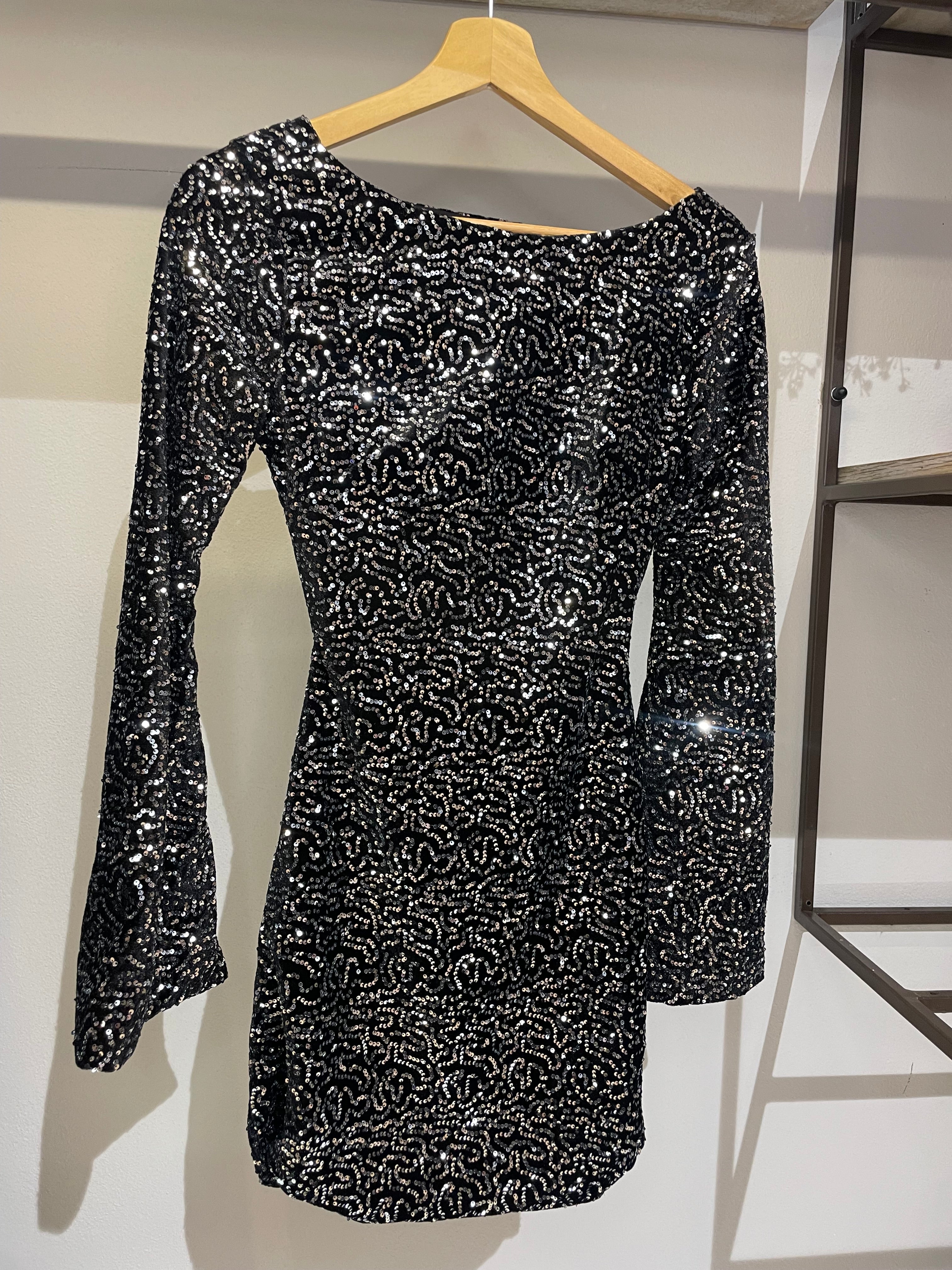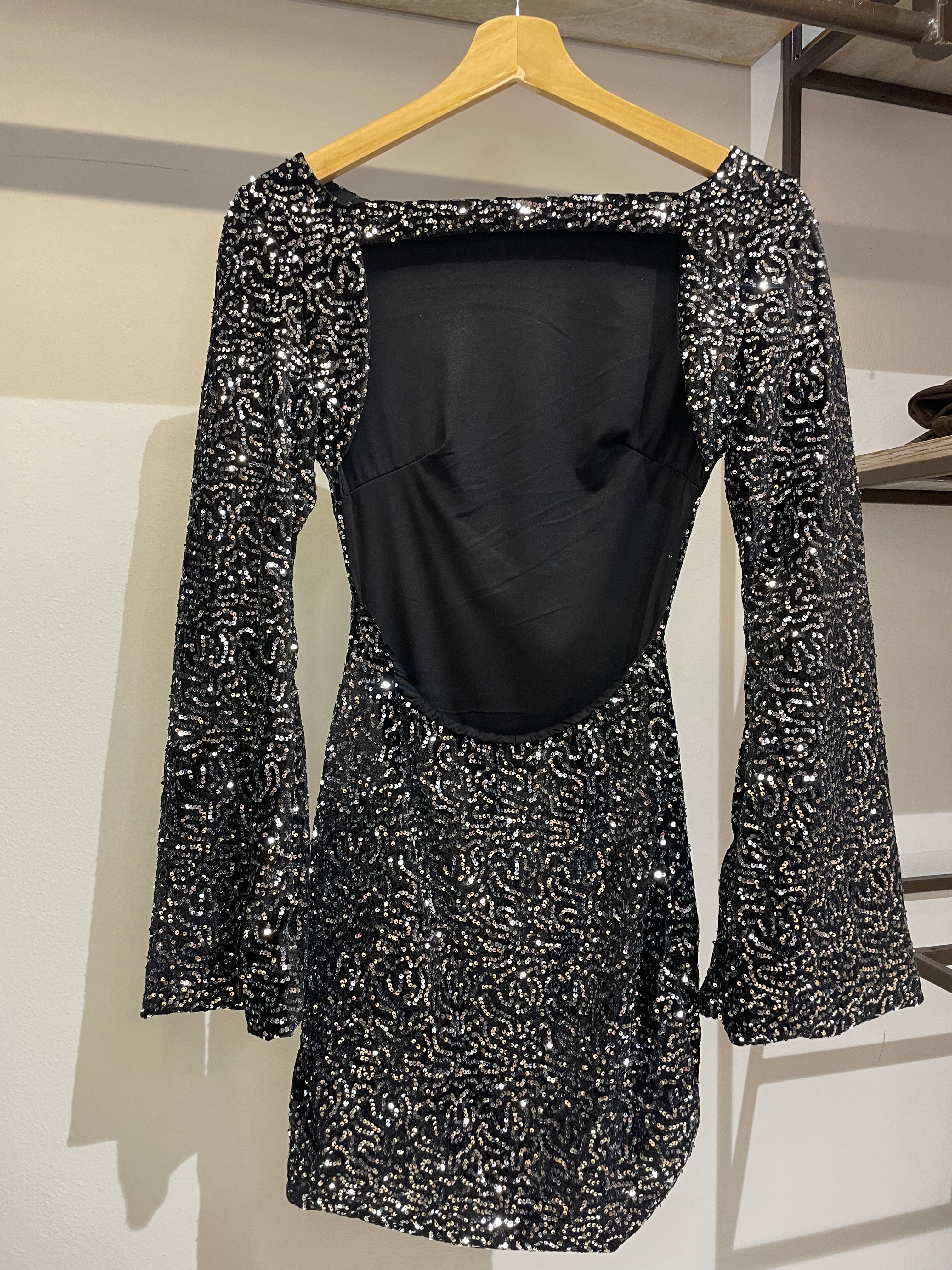 Abito a tubino con manica lunga, base velluto con paillettes applicate. Schiena scoperta. Vestibilità regolare, tessuto elastico. Veste da XS ad M abbondante.