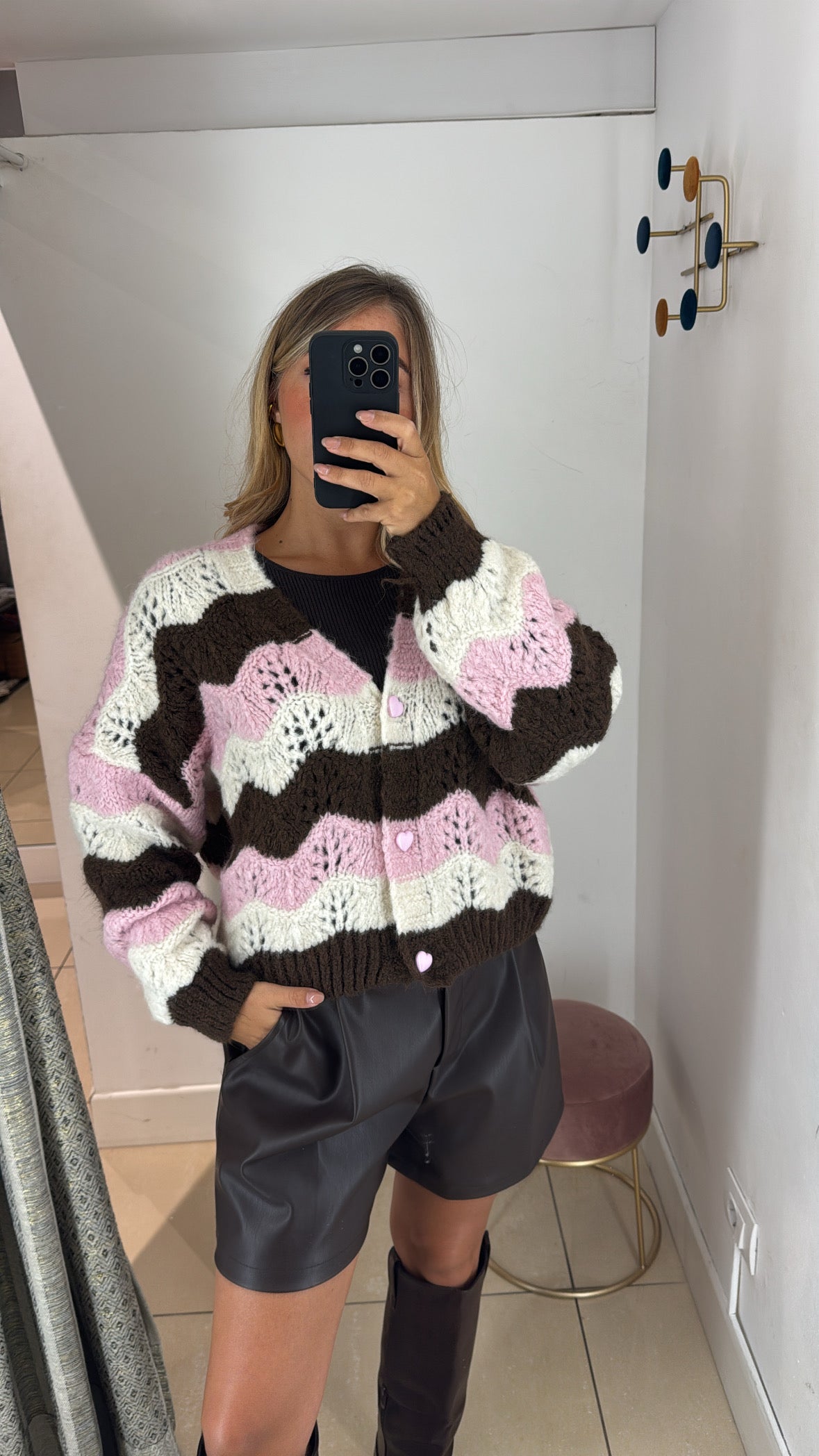 Cardigan multicolor con dettaglio bottone a cuore rosa