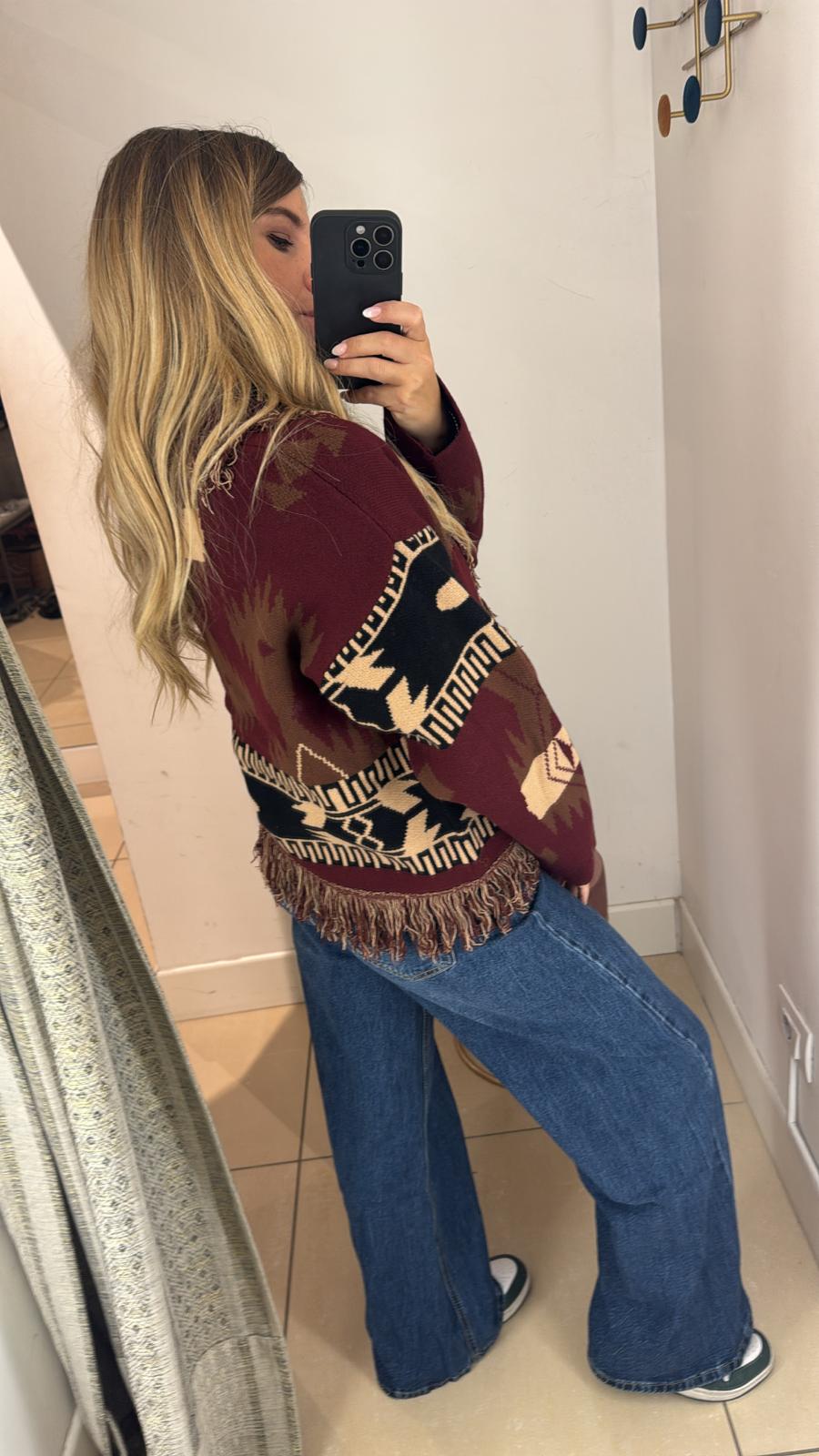Cardigan jacquard con motivo geometrico e frange decorative. Collo a scialle, cintura in vita e maniche lunghe. Linea morbida e struttura avvolgente. Fantasia sui toni del bordeaux, cammello e nero. 60% viscosa, 20% lana, 20% poliammide.