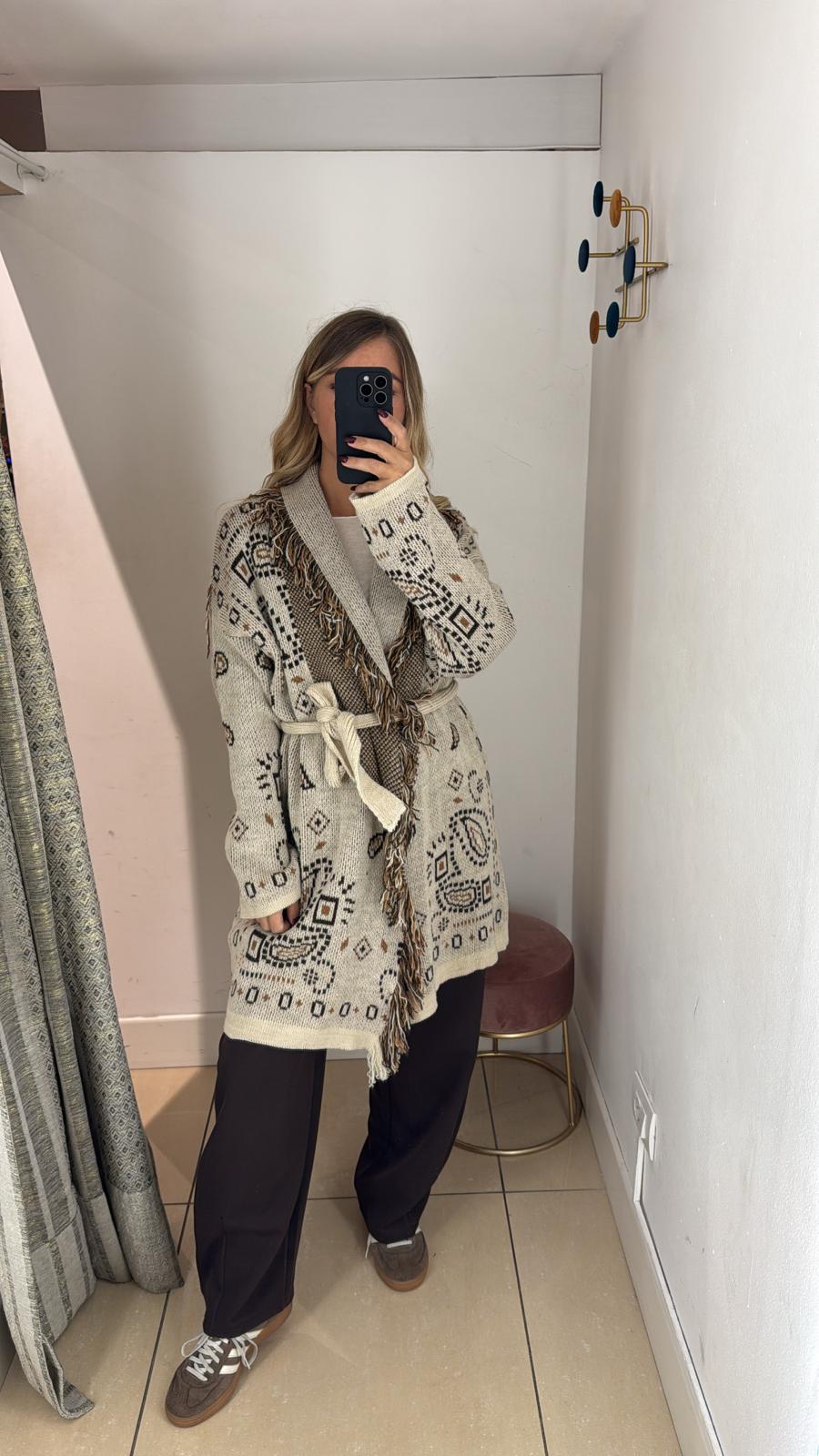 Cardigan in maglia pesante con lavorazione jacquard a motivo geometrico e dettagli in filo mélange. Collo sciallato, frange decorative e cintura in vita per una regolazione personalizzata. Vestibilità comoda, maniche lunghe. Composizione: 10% lana, 10% viscosa, 5% alpaca, 75% acrilico.