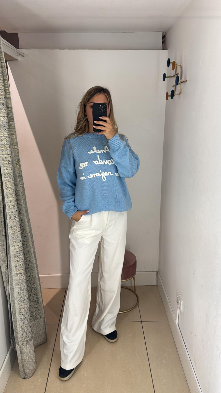 Maglione con scritta “anche secondo me ho ragione io”, vestibilità morbida. 56% acrilico, 28% poliammide, 8% lana, 8% viscosa.