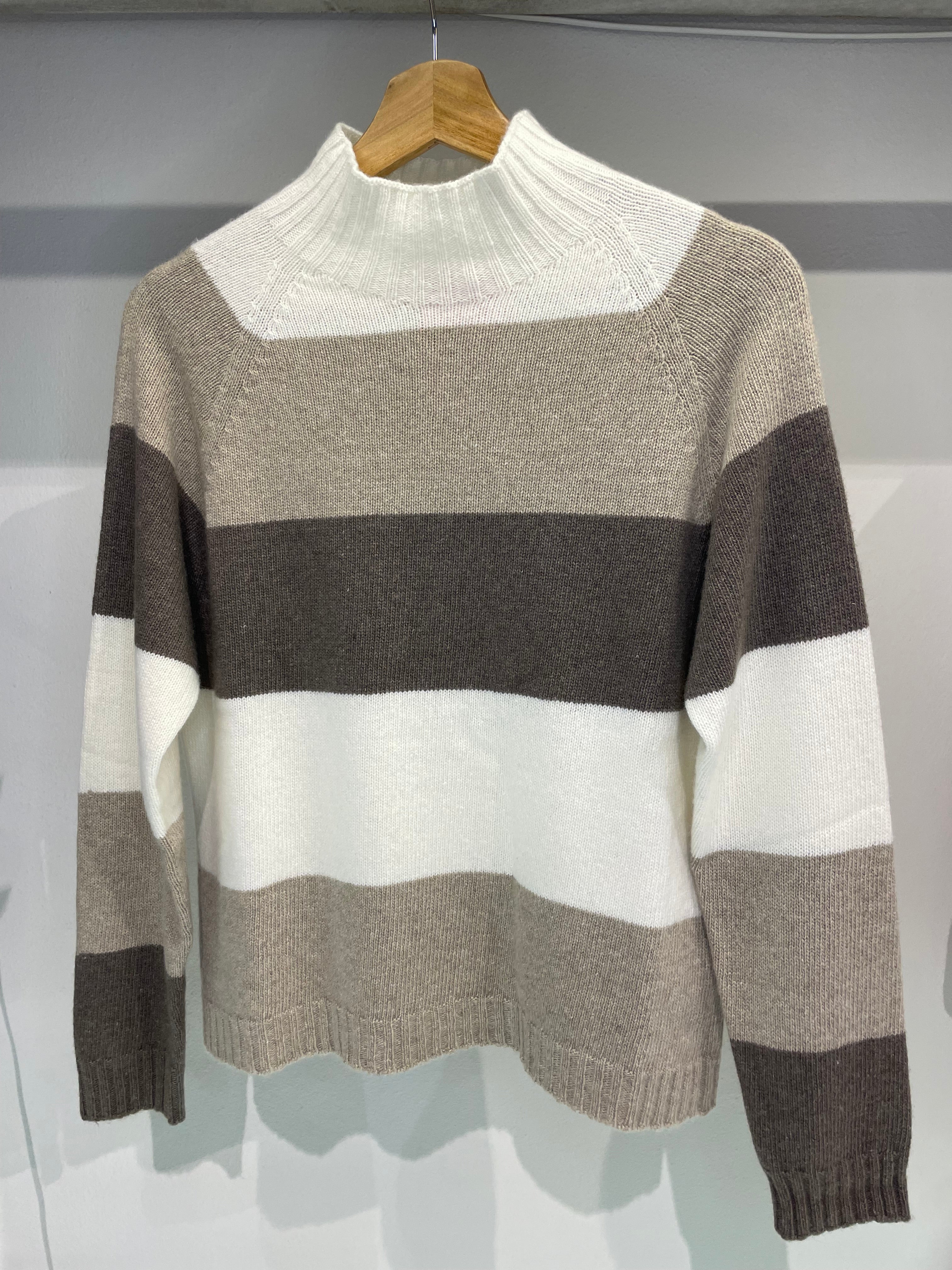 Maglione a righe in 45% lana, 25% viscosa, 10% cashmere e 20% nylon, con collo alto. Vestibilità regolare. Righe sui toni del bianco, taupe e beige.