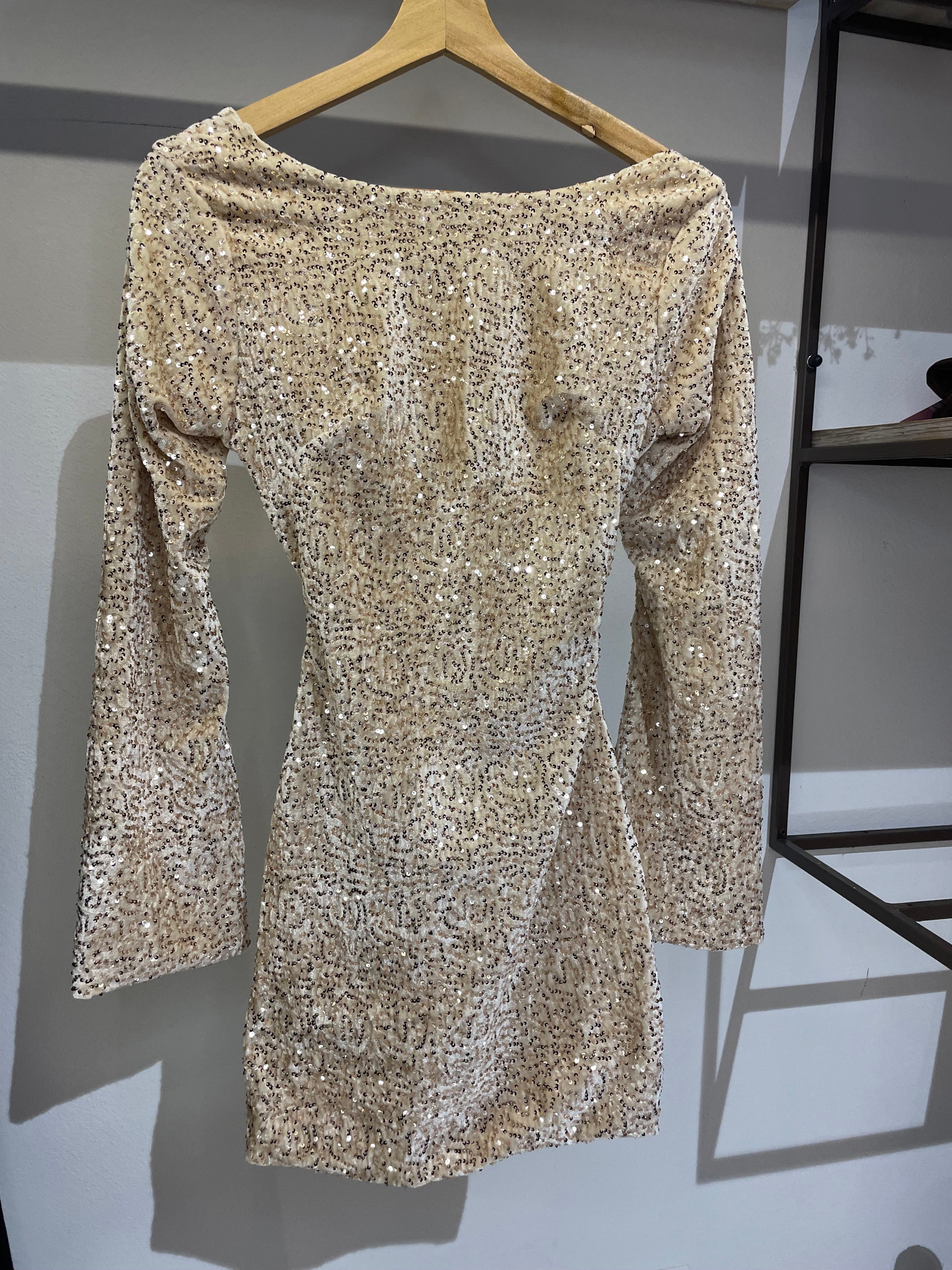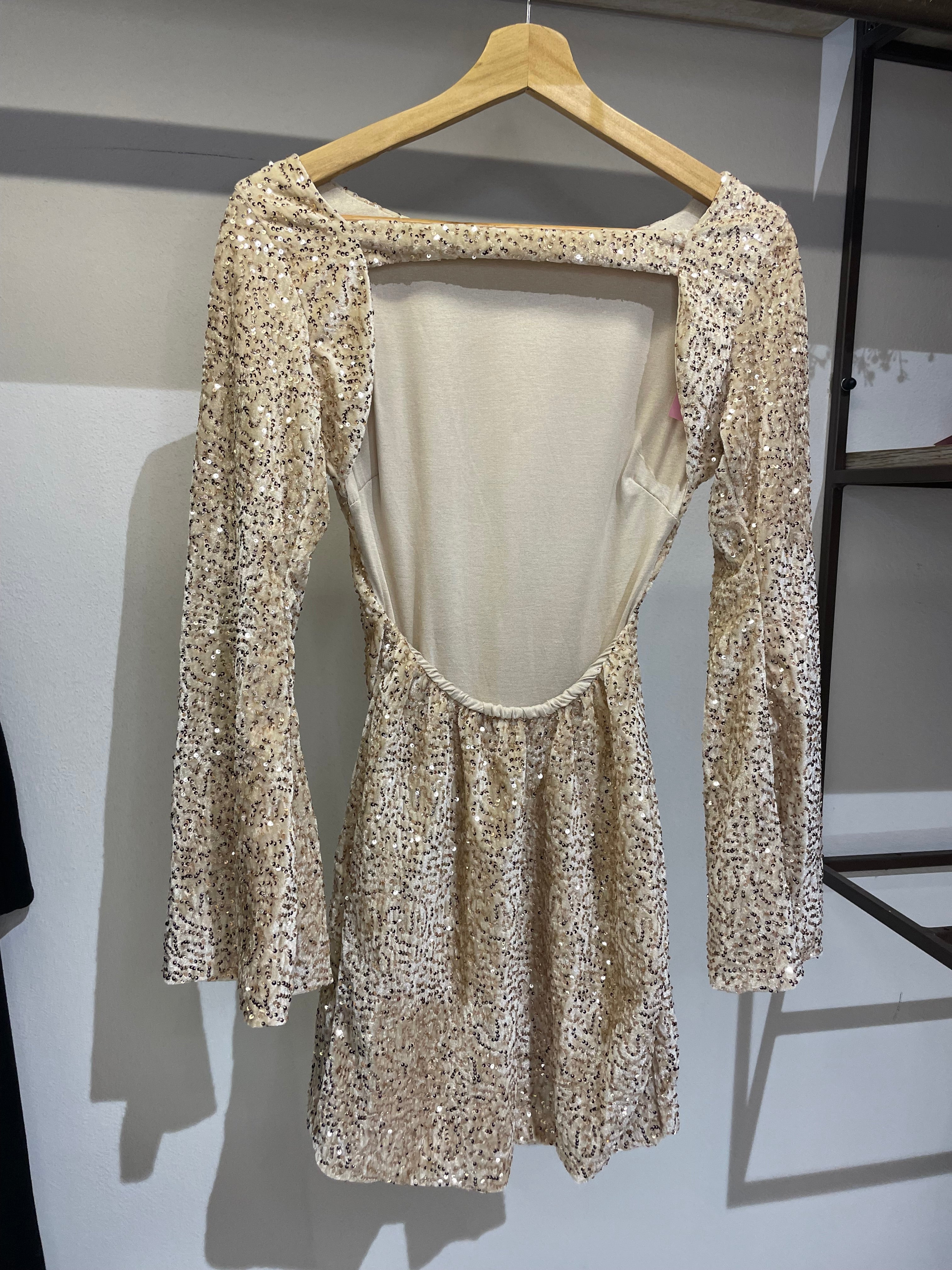 Abito a tubino con manica lunga, base velluto con paillettes applicate. Schiena scoperta. Vestibilità regolare, tessuto elastico. Veste da XS ad M abbondante.