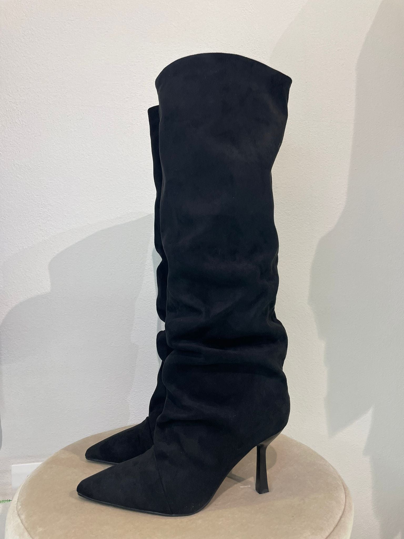 Stivale alto scamosciato con tacco, altezza al ginocchio.