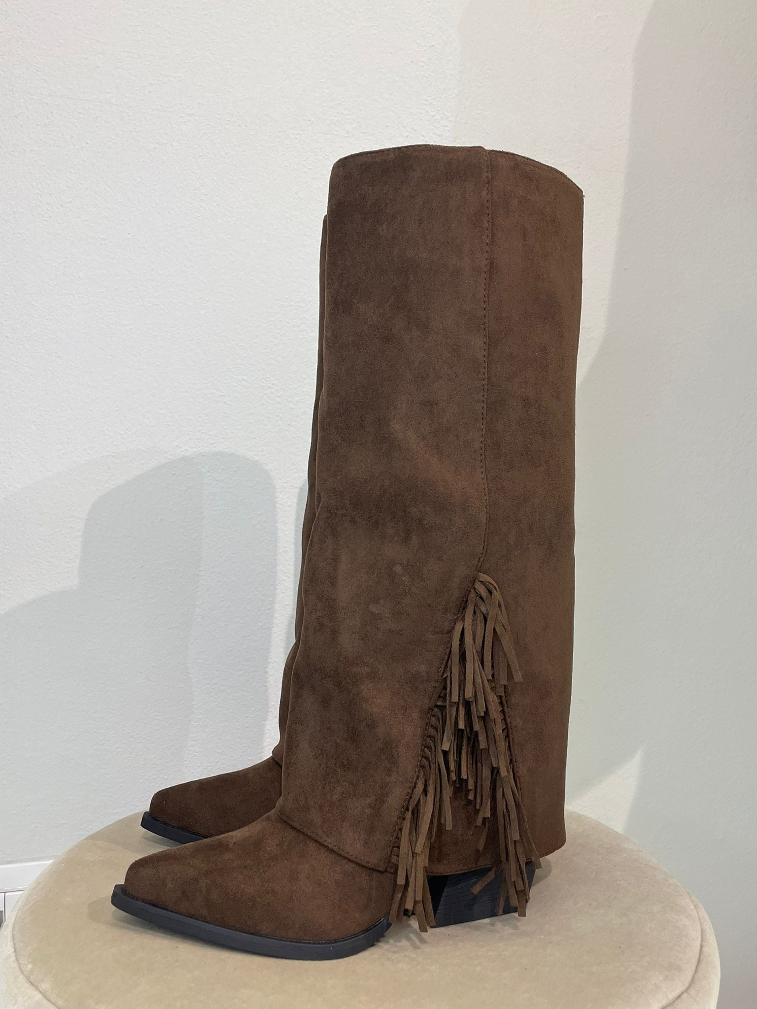 Stivale altezza sotto al ginocchio, para morbida, dettaglio frange.